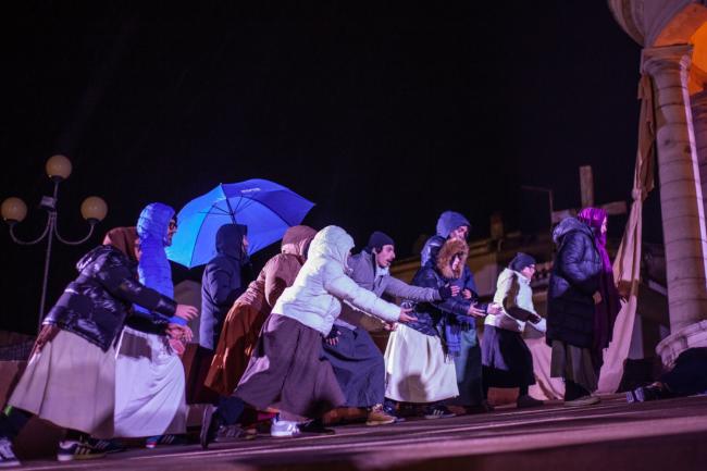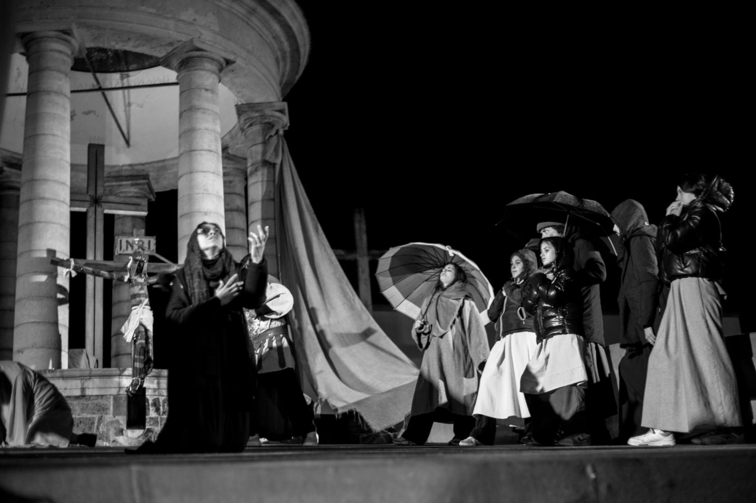 Accanto a questa dimensione partecipativa, gli organizzatori hanno voluto richiamare anche l’intenso lavoro che ha preceduto la rappresentazione. Le prove si sono svolte per un’intera settimana in condizioni meteorologiche spesso avverse, con pioggia battente e temperature rigide. Un contesto che ha reso particolarmente impegnativo l’allestimento e la preparazione, mettendo a dura prova il cast, i figuranti, l’orchestra e il personale tecnico. Nonostante le difficoltà, il lavoro è proseguito senza interruzioni significative, sostenuto da un forte senso di responsabilità e dalla volontà di garantire alla comunità il tradizionale appuntamento.