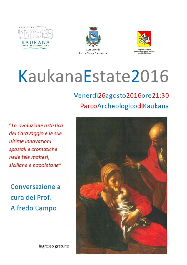 Questo il titolo della conferenza che il prof Alfredo Campo giorno 26 agosto ore 21:15 farà all'interno del Parco Archeologico di Kaukana. Sarà evidenziato con immagini il percorso artistico iniziale di Caravaggio e approfondito quello inerente al suo travaglio spirituale ed artistico, nonchè le sue innovazioni spaziali e pittoriche del suo ultimo peregrinare a Malta, Sicilia e Napoli in cui sarà dimostrato l'utilizzo della luce costruttiva e del colore in cui le velature sono di alta modernità e attualità .
