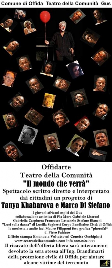 Tutti a Offida per un avvenimento unico ed irripetibile che vedrà uniti per IL MONDO CHE VERRA' persone che mai avrebbero immaginato essere insieme! Costa d'Avorio, Nigeria, Guinea, Senegal,Togo, Italia... I giovani ospiti del Gus arrivati da poche settimane hanno trovato in Offida una realtà aperta e solidale. Il Teatro della Comunità ... la sua magia sta per prendere forma! Giorno 3 settembre dalle ore 21 andrà in scena il 93° spettacolo realizzato in questo modo: sudore, fatica, gioie e dolori, un concentrato di energia e poesia struggente ricordo e voglia di riscatto! L'Africa, la madre Africa è anche dentro ognuno di noi !