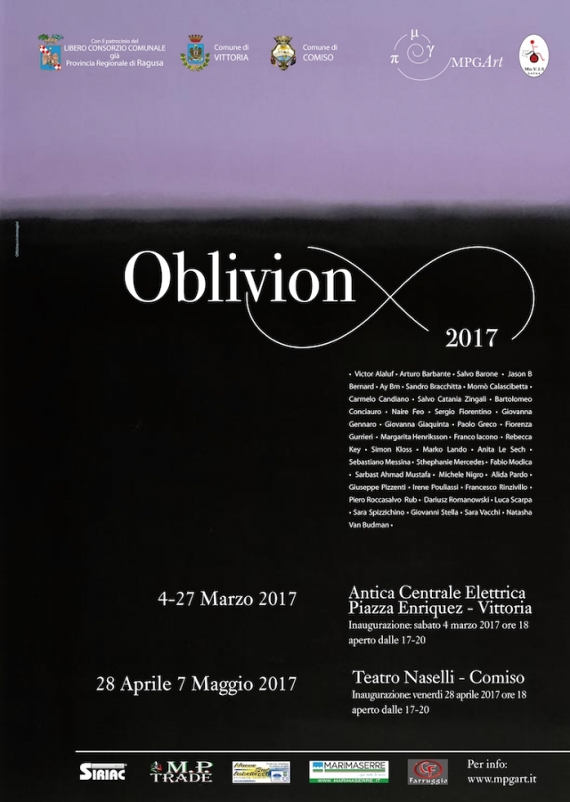 “Oblivion” è il titolo della collettiva d’arte contemporanea, organizzata dall’associazione culturale MPGArt di Vittoria e curata da Melissan Gurrieri e Giovanna La Cava, che sarà inaugurata sabato 4 marzo, alle 18.00, all’Antica Centrale Elettrica di piazza Enriquez a Vittoria, dove resterà allestita fino al 27 marzo. Una collettiva che riunirà circa 40 artisti da tutto il mondo che, attraverso le varie forme d’arte, come la pittura, la scultura, la fotografia, la video art e le installazioni, daranno espressione, immagine, fisicità all’oblio e alla memoria.