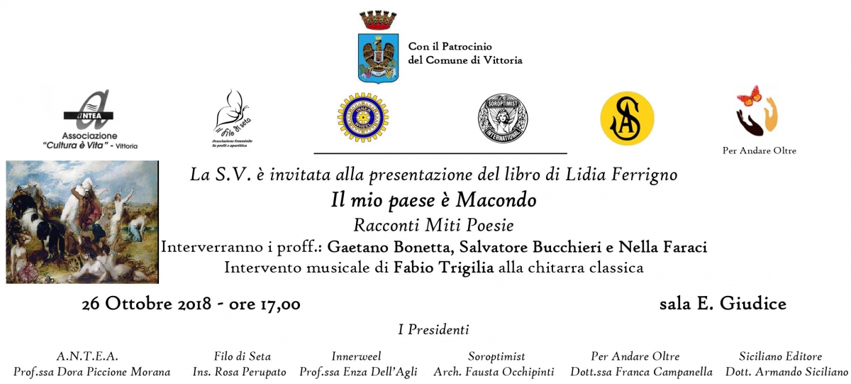 Le associazioni di promozione culturale, umana e sociale e i club service della città: il Filo di seta, Antea, Soroptimist, Innerweel, Per andare Oltre e Siciliano editore, si sono date appuntamento alle ore 17,00 per la presentazione del libro della Prof.ssa Lidia Ferrigno dal titolo “ Il mio paese è Macondo”, Racconti, Miti e Poesie.