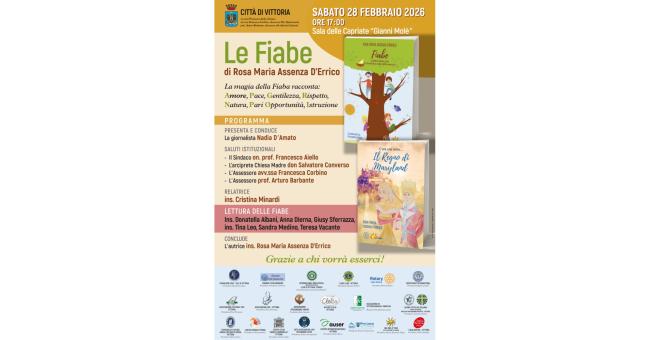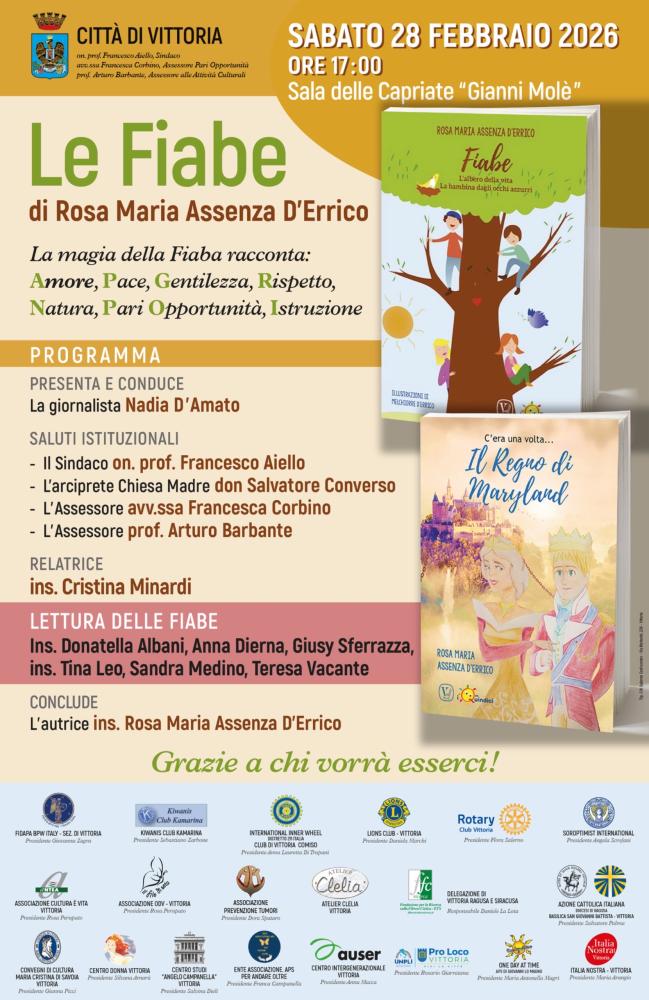 Un appuntamento che intreccia letteratura, educazione civica e impegno sociale. Sabato 28 febbraio 2026, alle ore 17.00, nella Sala delle Capriate “Gianni Molè”, si terrà la presentazione delle fiabe di Rosa Maria Assenza D’Errico, promossa dalla Città di Vittoria.