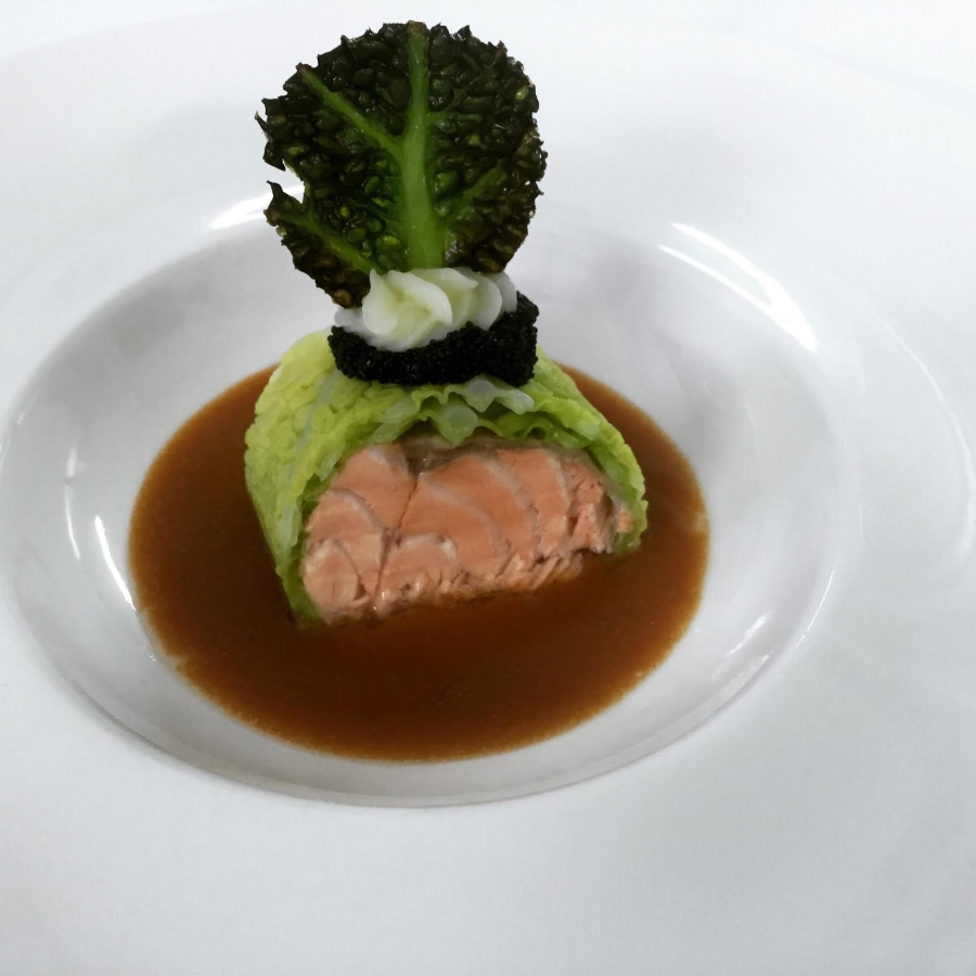 Trancio di salmone in veste di verza su vellutata di crostacei