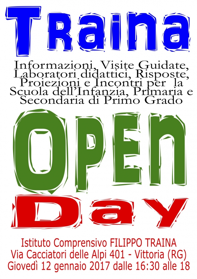 Anche quest'anno, l'I.C. Traina, apre le porte a genitori e futuri alunni per farsi conoscere, in vista dell'immediata scelta dell'Istituto per l’anno scolastico successivo. Si perché, come avrete capito, l’open day è proprio questo: un giorno in cui la scuola si presenta e mostra il suo lato migliore!!!