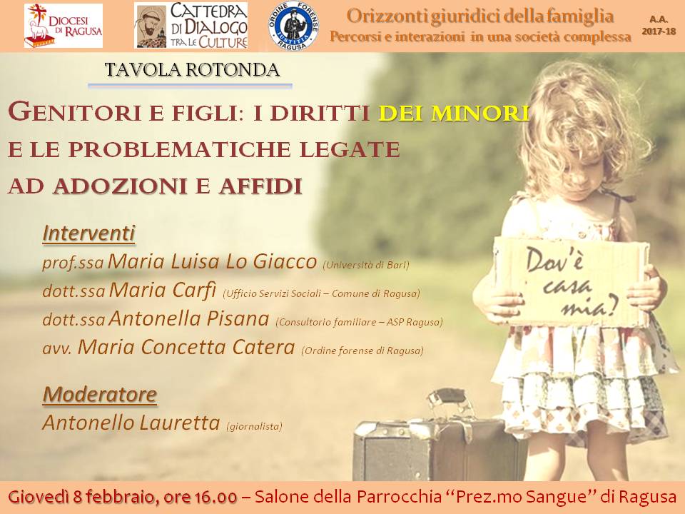 L’ incontro si terrà giovedì 8 febbraio presso i locali della Chiesa del Preziosissimo Sangue a Ragusa ed è inserito nel ciclo di incontri formativi "Orizzonti giuridici della famiglia" organizzato dalla Cattedra di "Dialogo tra le culture" di Ragusa in collaborazione con l´Ordine Forense di Ragusa.