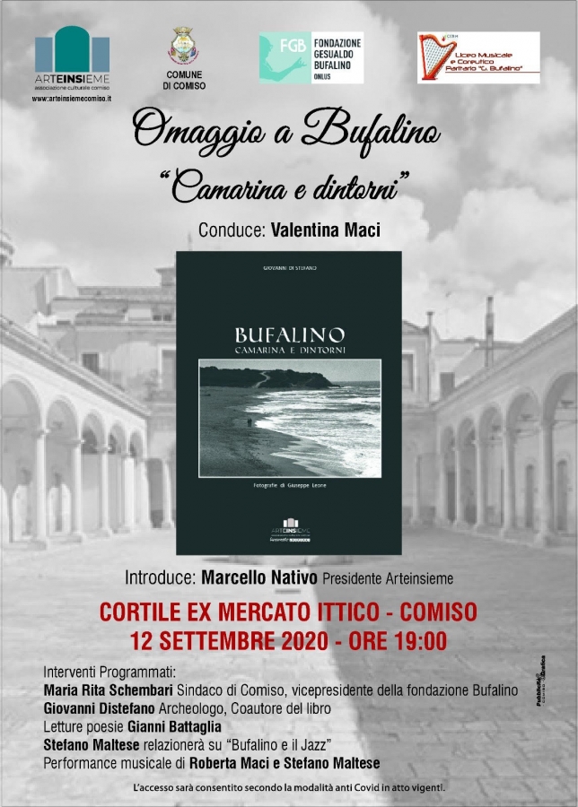 “Omaggio a Bufalino ‘Camarina e Dintorni’” nel cortile dell’ex mercato ittico di Comiso giorno 12 settembre 2020 alle 19. L’associazione Arteinsieme Comiso, presidente Marcello Nativo, continua a promuovere la cultura e sceglie di omaggiare il grande scrittore Gesualdo Bufalino con un nuovo evento in collaborazione con il Comune di Comiso, la Fondazione Gesualdo Bufalino Onlus e il Liceo Musicale e Coreutico Paritario “G.Bufalino”. Sarà presente il sindaco Maria Rita Schembari vicepresidente della Fondazione Bufalino di Comiso. Una serata all’insegna della letteratura e della musica grazie alla partecipazione di uno degli autori del libro “Bufalino Camarina e Dintorni” dott. Giovanni Di Stefano, testo edito grazie al supporto di Arteinsieme Comiso. Ad omaggiare l’autore ci saranno i musicisti Stefano Maltese e Roberta Maci. Stefano Maltese relazionerà su “Bufalino e il jazz”. L’attore e regista Gianni Battaglia interpreterà le liriche “Al Fiume” e “Dintorni di Camarina” che sono il fil rouge del testo di Distefano e farà un omaggio allo scrittore anche con il recital di alcuni brani tratti da “L’Amaro Miele” di Bufalino.