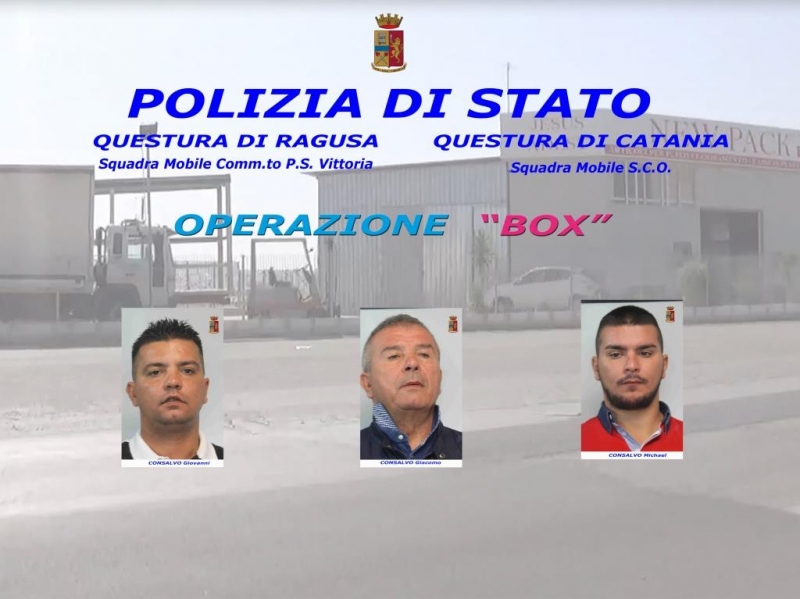 La Polizia di Stato questa notte ha eseguito le catture dei tre destinatari delle ordinanze di custodia cautelare e numerose perquisizioni, con il contributo degli uomini della Squadra Mobile di Ragusa e Catania, del Commissariato di Vittoria, della Squadra Volanti e delle unità cinofile di Catania per la ricerca di armi ed esplosivi. Si tratta dell'operazione denominata Box, ovvero cassetta; nome scelto proprio perché i tre arrestati si occupavano prevalentemente di commerciare cassette in legno e plastica. 30 gli uomini impiegati nell'imponente operazione necessaria perché oltre ai tre arresti, bisognava perquisire faraoniche ville ed enormi aziende di proprietà dei tre. Le unità cinofile, invece, sono state necessarie per poter ricercare armi, considerato che per gli inquirenti i tre soggetti avevano avuto la disponibilità di pistole di vario calibro. Le perquisizioni davano esito negativo ad eccezione di una, che ha permesso di acquisire importanti elementi probatori, considerato che sono stati rinvenuti titoli e contanti per quasi 450.000, tra cui assegni bancari, molti dei quali firmati in bianco. Tutti questi dati verranno analizzati con attenzione dalla Polizia Giudiziaria nei prossimi giorni. Il denaro, invece, stato gi depositato in attesa dell'esito delle indagini che verranno condotte per appurare la provenienza del contante e degli assegni. Secondo l'accusa Giacomo Consalvo 60 anni, ed i suoi figli Giovanni e Michael, di 35 e 26 anni, avevano imposto alle ditte del mercato Ortofrutticolo di Vittoria cassette e prodotti per l'imballaggio, con l'aggravante di aver agito con il metodo mafioso, avvalendosi della forza dell'intimidazione e della condizione di assoggettamento ed omert derivante da quella che gli inquirenti definiscono contiguità con il clan mafioso degli “stiddari”, i Dominante. Le indagini, durate anni, hanno permesso di raccogliere gravissimi indizi di colpevolezza. Tra questi tantissime intercettazioni telefoniche ed ambientali. Nelle telefonate emergono vari episodi in cui i tre raccontano di aver minacciato, picchiato, fatto estorsioni e, nel caso di Giacomo Consalvo, di avere rapporti abbastanza diretti con Totò Riina. La Polizia di Stato invita dunque gli onesti imprenditori a denunciare e fa sapere che le indagini proseguiranno, così da garantire a chi opera all'interno del mercato ortofrutticolo di Vittoria di poter lavorare senza il peso di soggetti contigui alle associazioni mafiose.