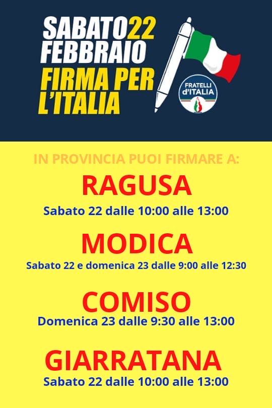 “Giorno 22 e 23 febbraio saremo nelle Piazze della provincia di Ragusa per raccogliere le firme per la presentazione di quattro proposte di legge concernenti l’elezione diretta del Presidente della Repubblica, l’abolizione dei Senatori a vita, l’istituzione del tetto alle tasse in Costituzione e la supremazia dell’ordinamento Italiano su quello Europeo” a dichiararlo è il coordinatore provinciale Salvo Sallemi “anche in provincia e nello specifico a Ragusa, sabato 22 dalle ore 10:30 alle 13.00 in Via Paestum angolo via Piersanti Mattarella, a Modica, sabato 22 dalle 09:00 alle 12:30 Largo Innocenzo Pluchino e domenica 23 dalle 09:00 alle 12:30 Piazza Monumento, a Comiso Domenica 23 dalle 09:00 alle 13:00 Piazza San Biagio e a Giarratana sabato 22, dalle 10:00 alle 13:00 Villetta in Via Siracusa dalle 10:00 alle 13:00. Tutti i cittadini potranno recarsi nelle postazioni muniti di un documento d’identità in corso di validità e sottoscrivere le quattro proposte di legge di iniziativa popolare promesse da Giorgia Meloni. I moduli posso firmarsi anche presso gli uffici dei segretari Comunali, gli interessati potranno rivolgersi direttamente a i circoli della provincia per avere maggiori informazioni.