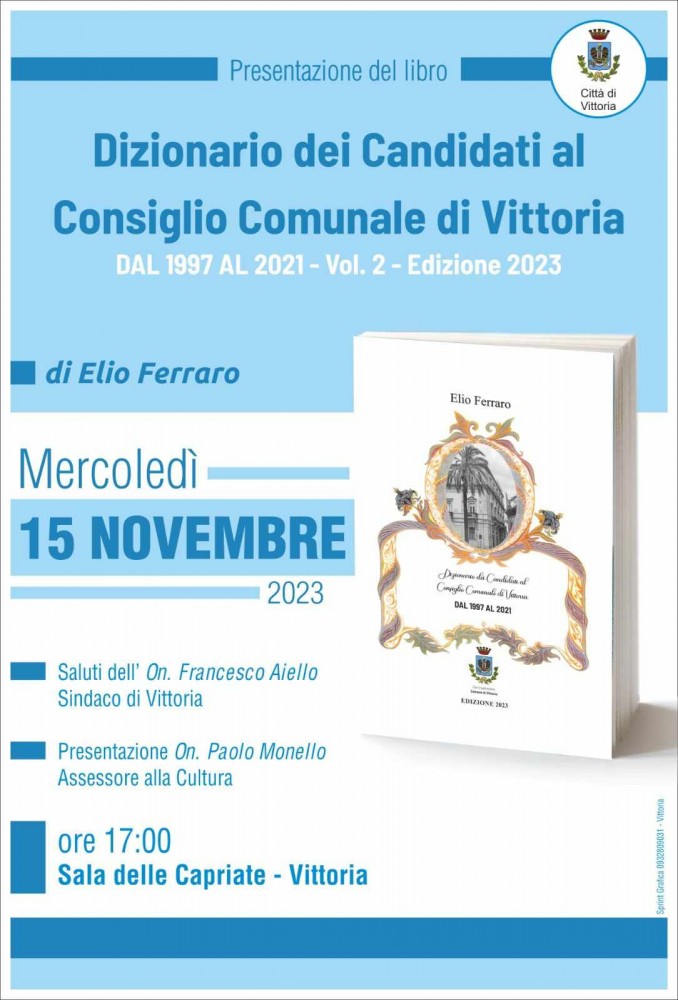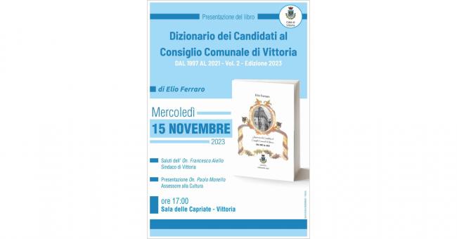 Si terrà il 15 Novembre prossimo la presentazione del libro "Dizionario dei Candidati al Consiglio Comunale di Vittoria - dal 1997 al 2021 Vol.2 Ed. 2023 di Elio Ferraro.